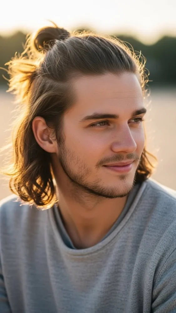 It’s cleaner than a messy bun but softer than a fade. This style suits men who want balance and versatility.