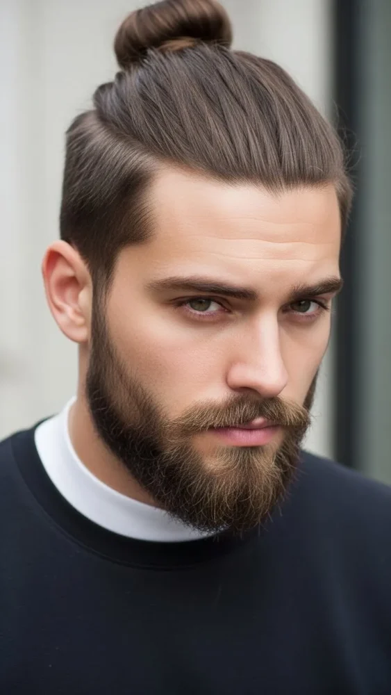 Pairing a man bun with a full or shaped beard creates a powerful, masculine look.