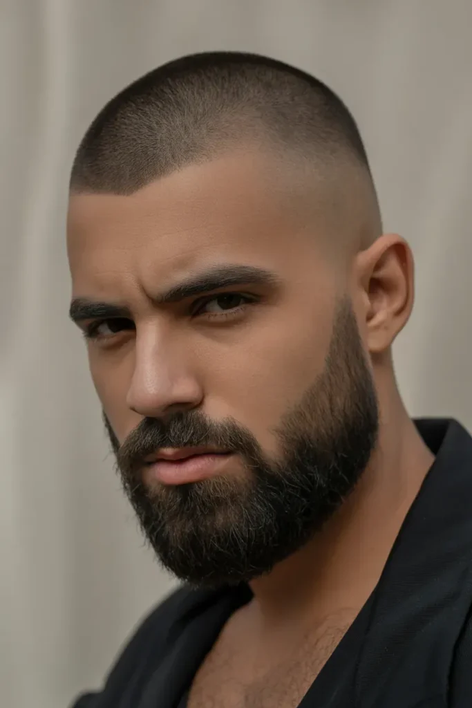 Pairing a buzz cut with a blended beard creates a strong and balanced look. The transition from the short hair to the beard adds depth and frames the face beautifully.