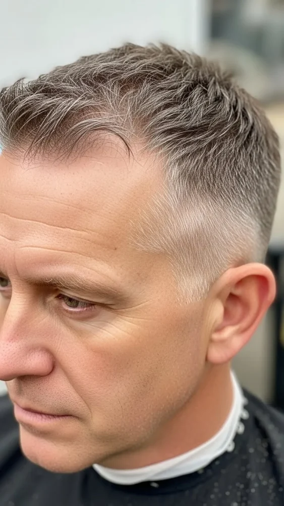 A textured crew cut keeps the top slightly uneven, adding movement and depth.