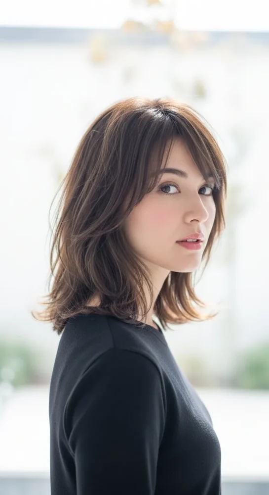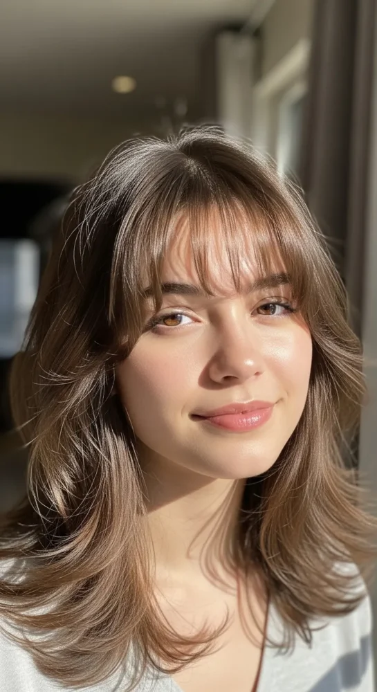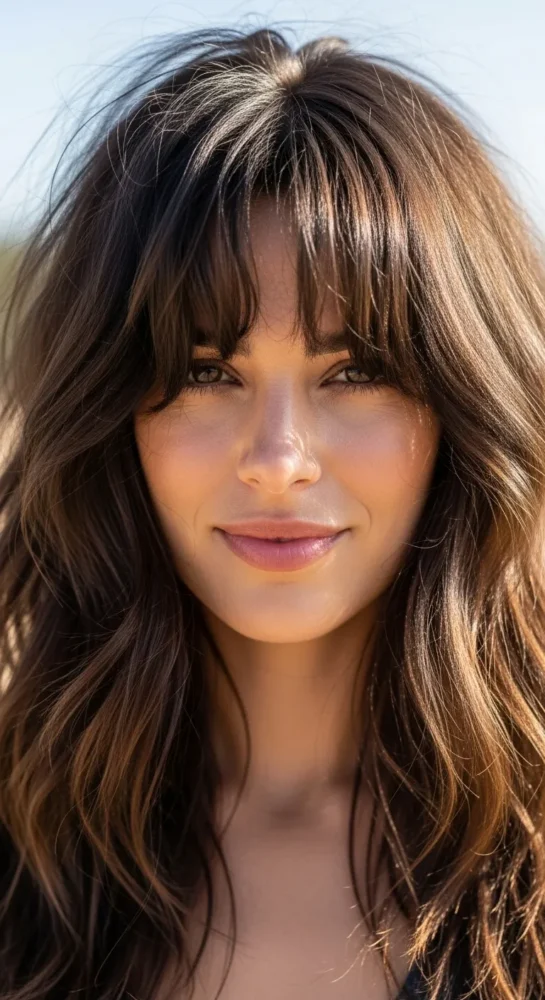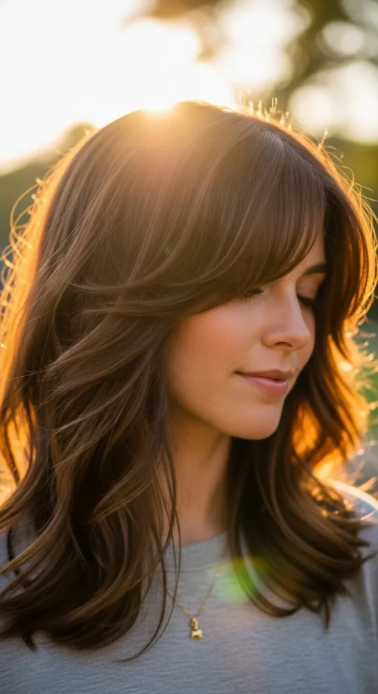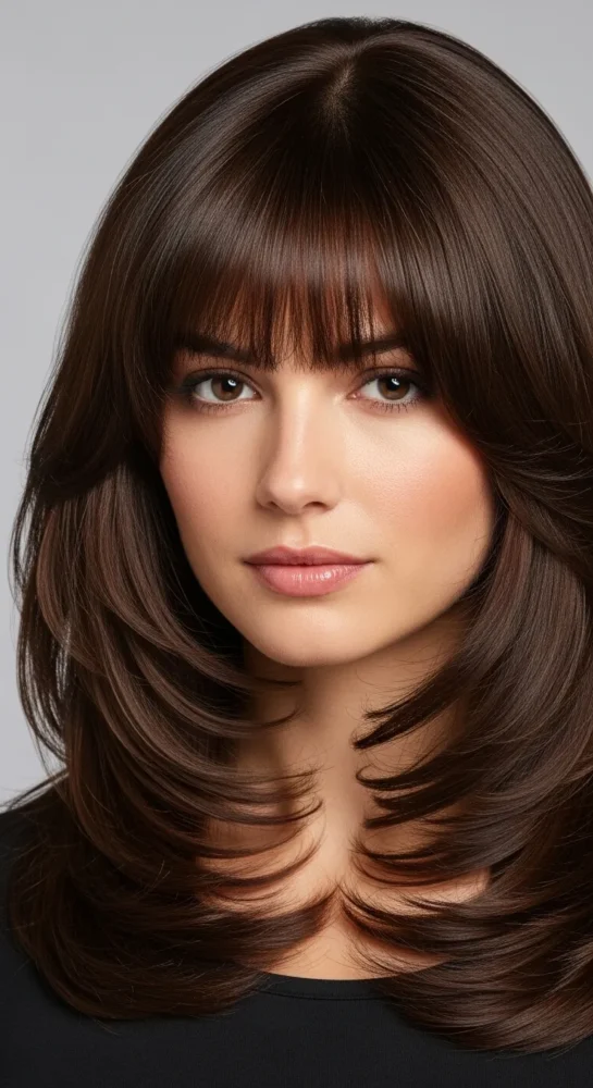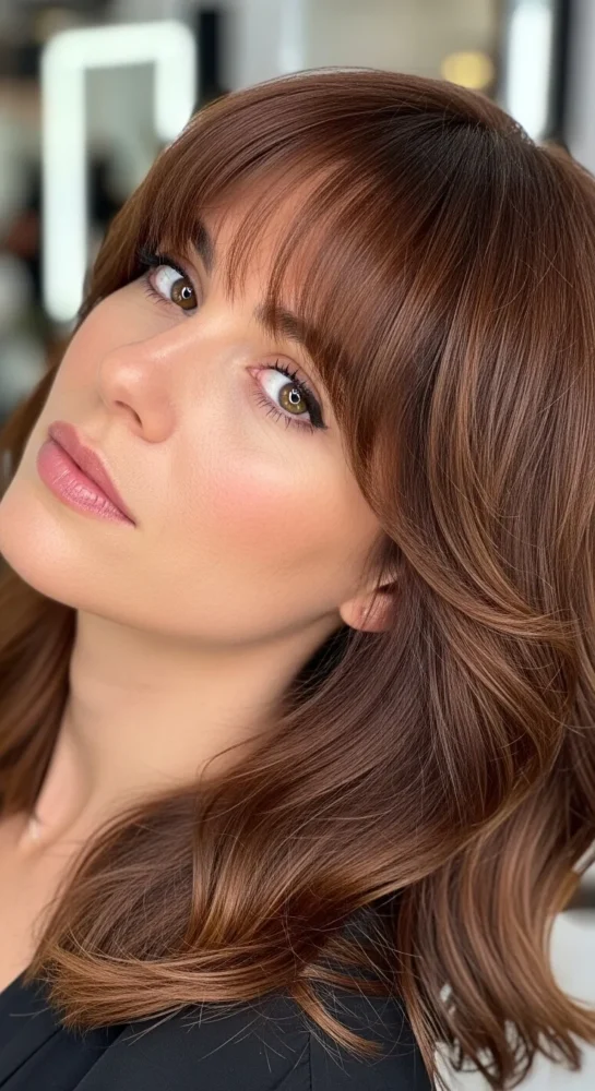 Soft, face-framing curtain bangs paired with long layers create movement and volume. This look is ideal for medium-length hair and works beautifully with chestnut or chocolate brown shades.