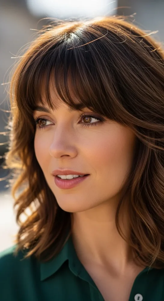 Warm chestnut tones pair beautifully with layered bangs, creating a natural, sun-kissed softness.