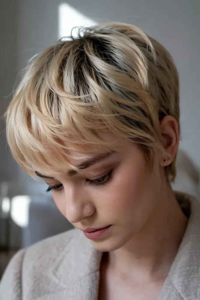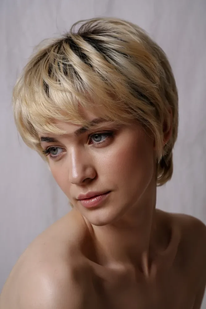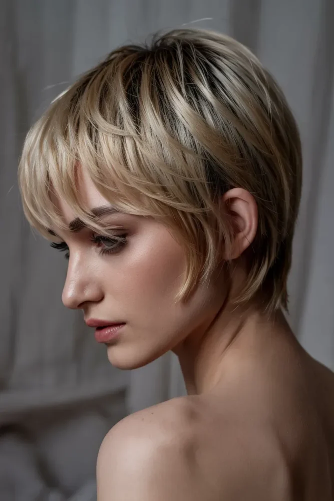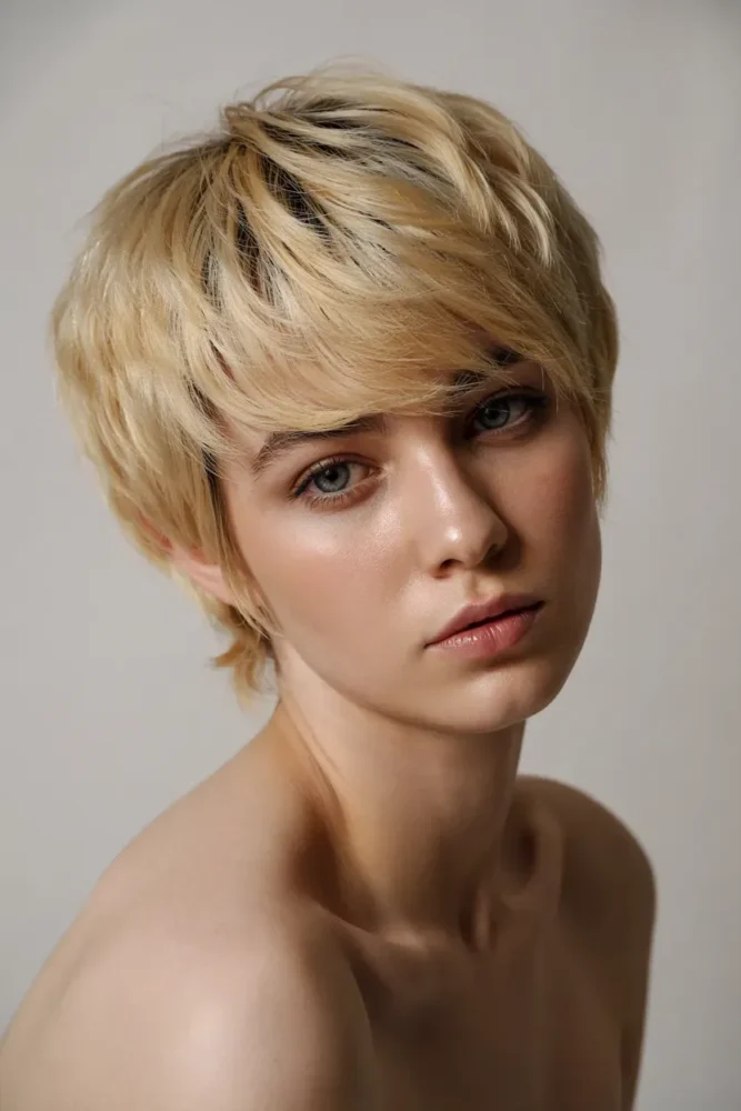 A deep side part instantly adds height at the front and balances facial features. Combined with short blonde layers, this cut creates a clean yet dynamic look that’s easy to refresh daily.