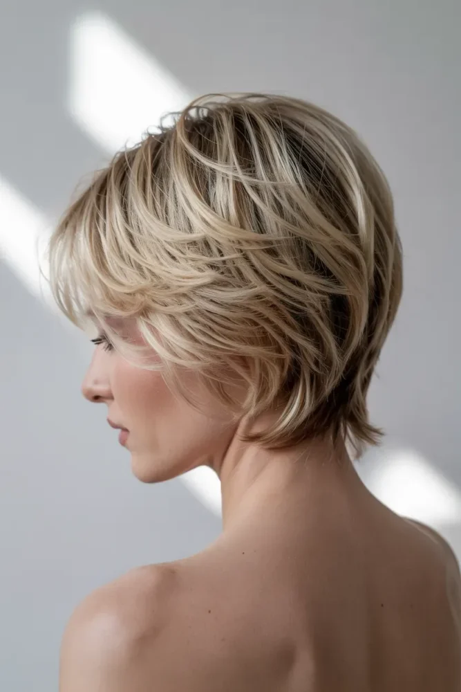 A stacked pixie bob combines short length with built-in volume. The back is layered and stacked, giving instant lift without teasing. It looks especially strong from side and back angles, which is why it performs so well on Pinterest.