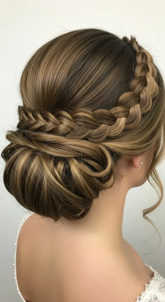 A braided crown wrapped into an updo looks intricate but is easier than it seems. It’s a great choice if you want your hair fully up while still looking soft and romantic.