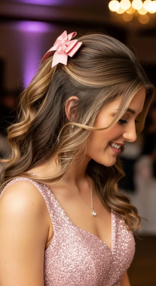 A subtle hair bow made from your own hair adds a cute, youthful touch. This style works great for girls who want something unique but still elegant. It pairs beautifully with soft curls.