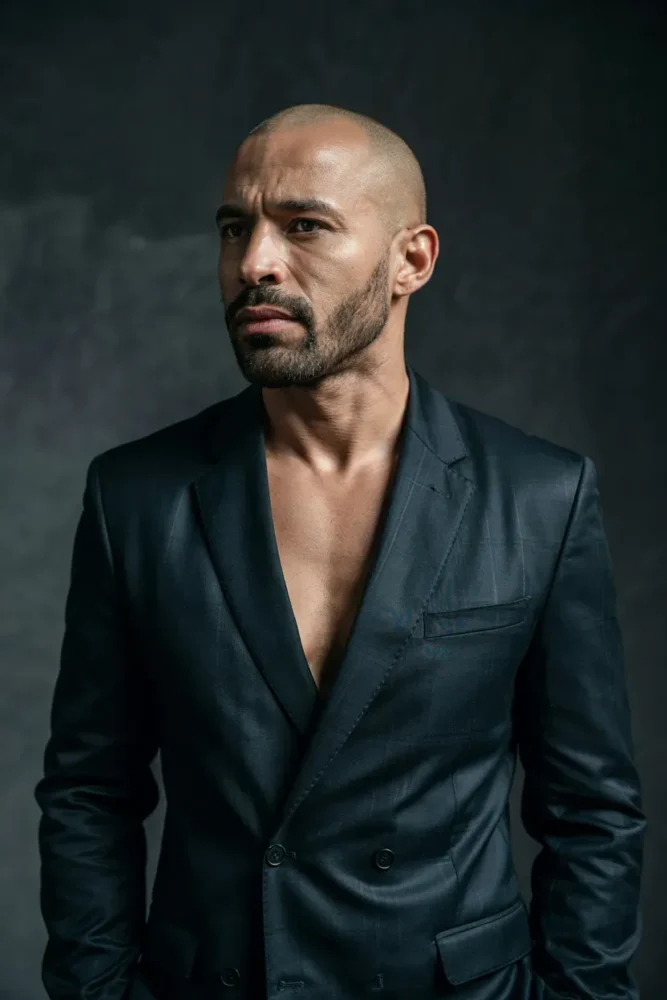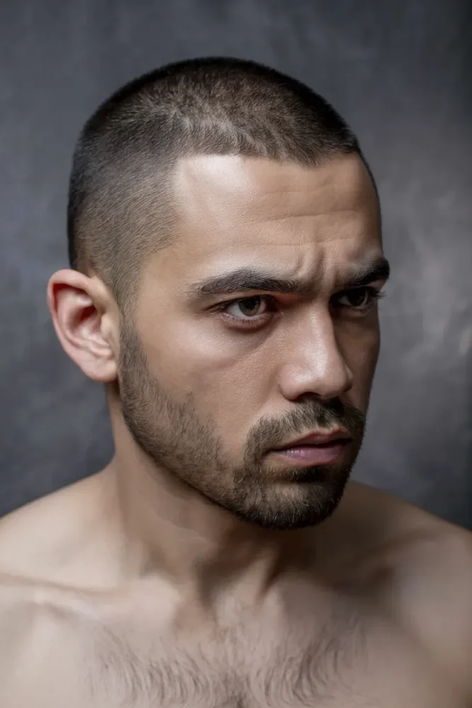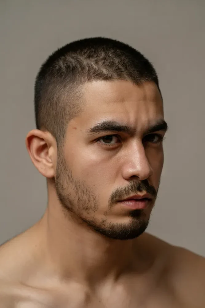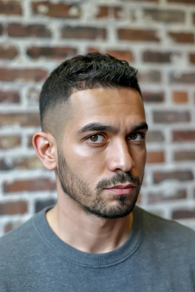 Minimal hair, maximum impact. This style puts all the focus on the beard fade and jawline.
