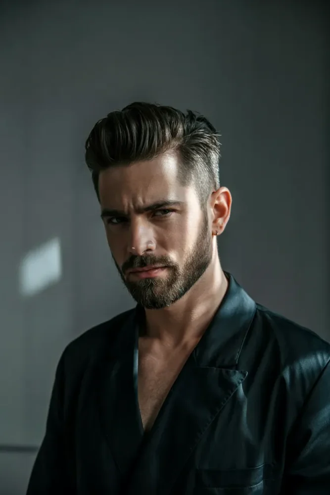 This combination screams confidence. The volume on top balances the faded beard, creating a strong silhouette.