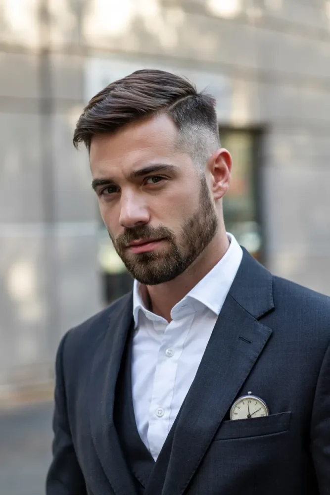 Classic meets modern. The side part adds structure while the beard fade keeps things current.