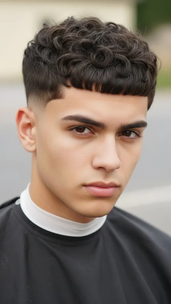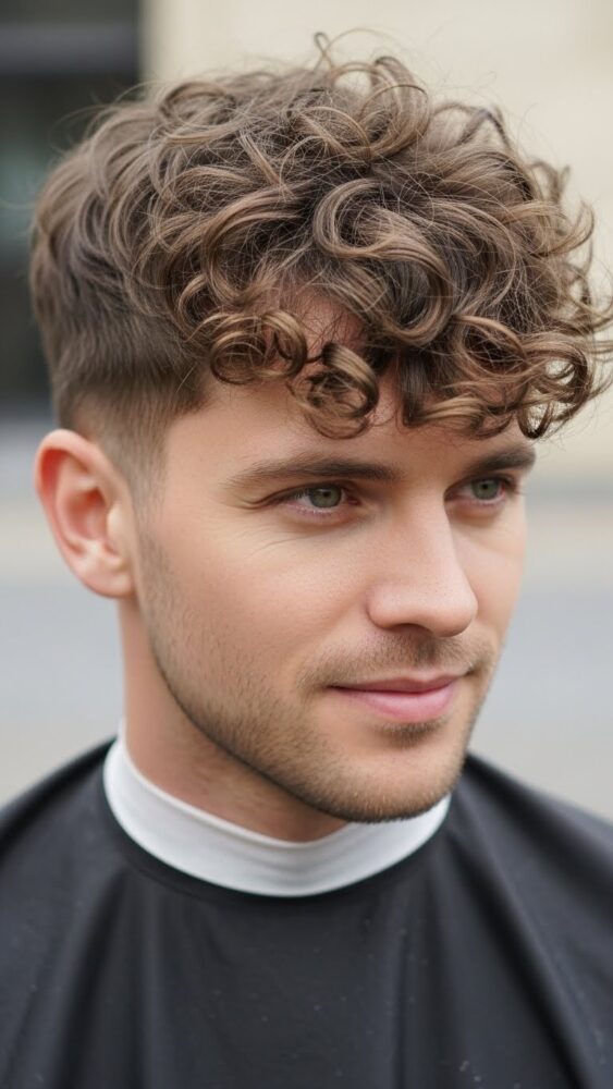 This style keeps curls falling forward, softening the face while adding personality. It’s youthful and stylish without being overdone. A smart Hair Men Haircut for casual wear.