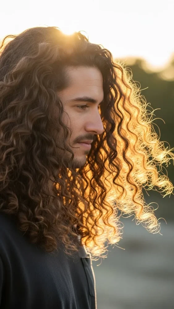 Long curls flowing naturally create a relaxed, confident style. This Hair Men Haircut works best with healthy hair care routines.