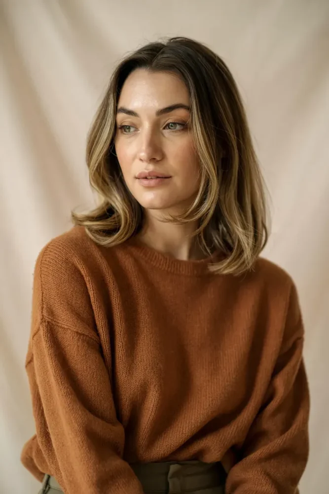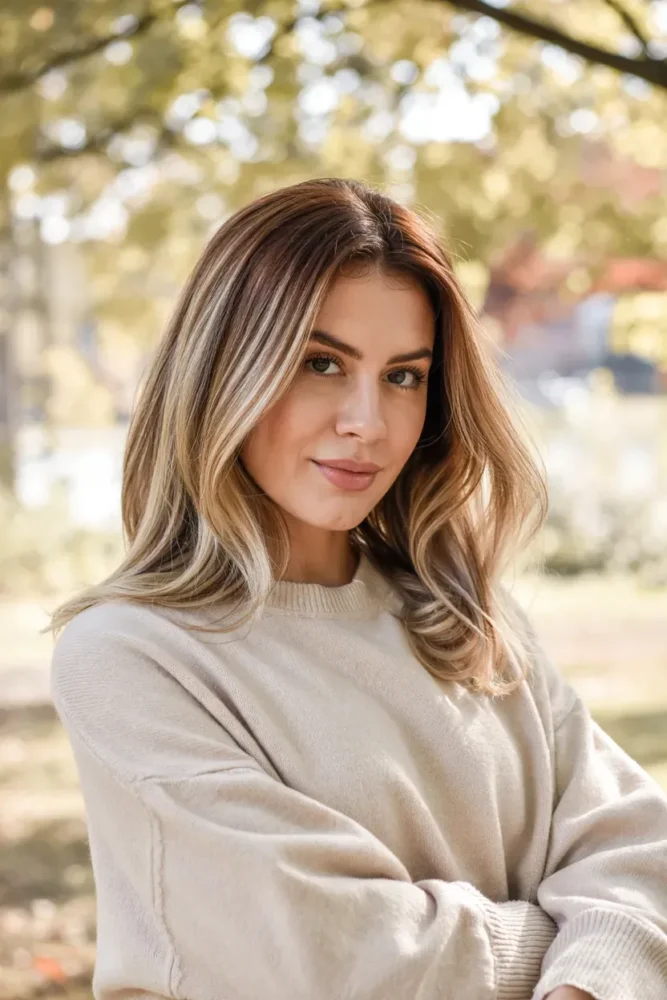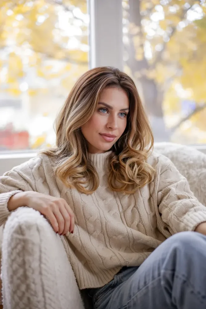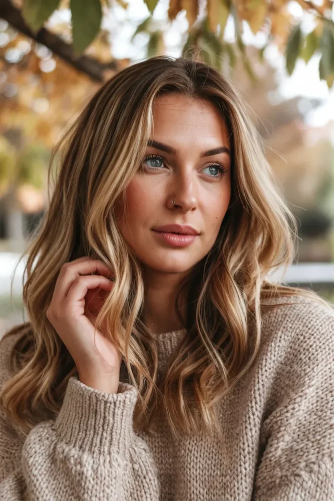 Cozy blonde balayage combines warm tones, soft blending, and natural depth. It’s one of the most saved fall looks because it suits almost every hair length and texture.