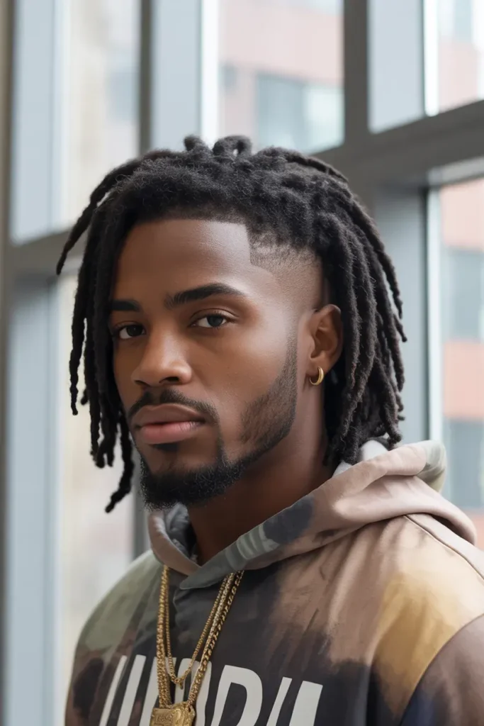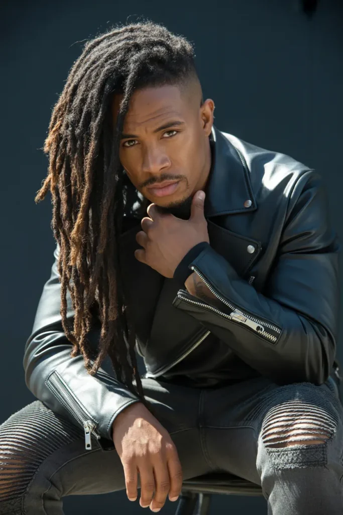 The contrast between the shaved or faded sides and the thick locs on top creates a strong visual impact.