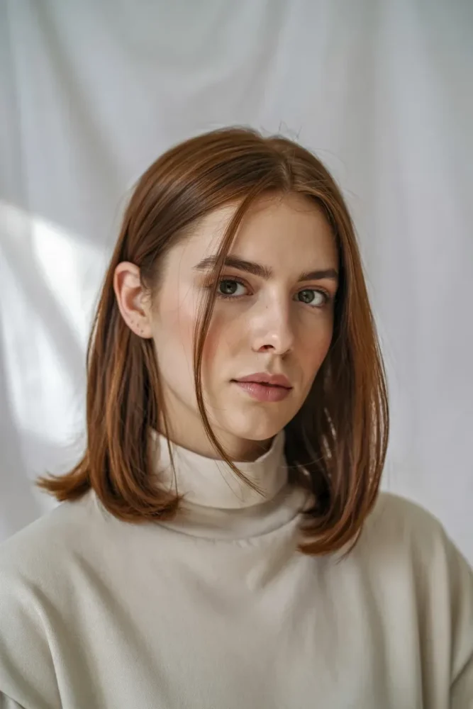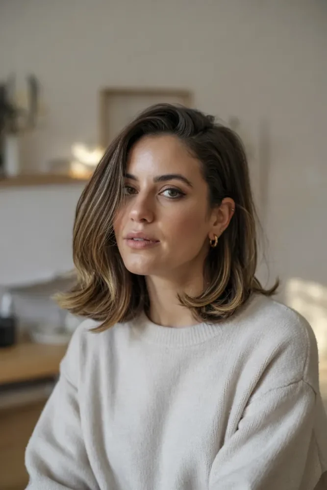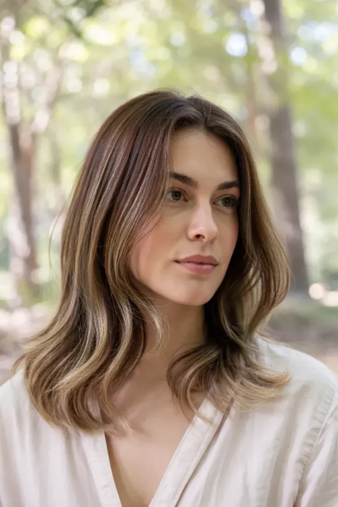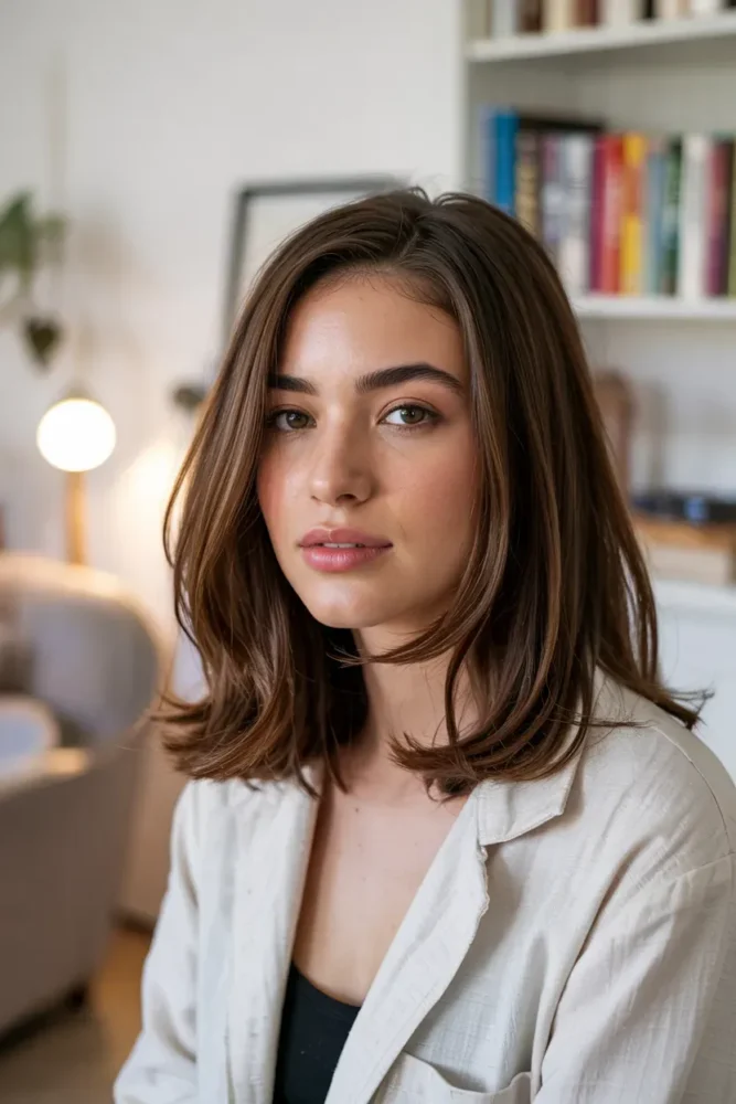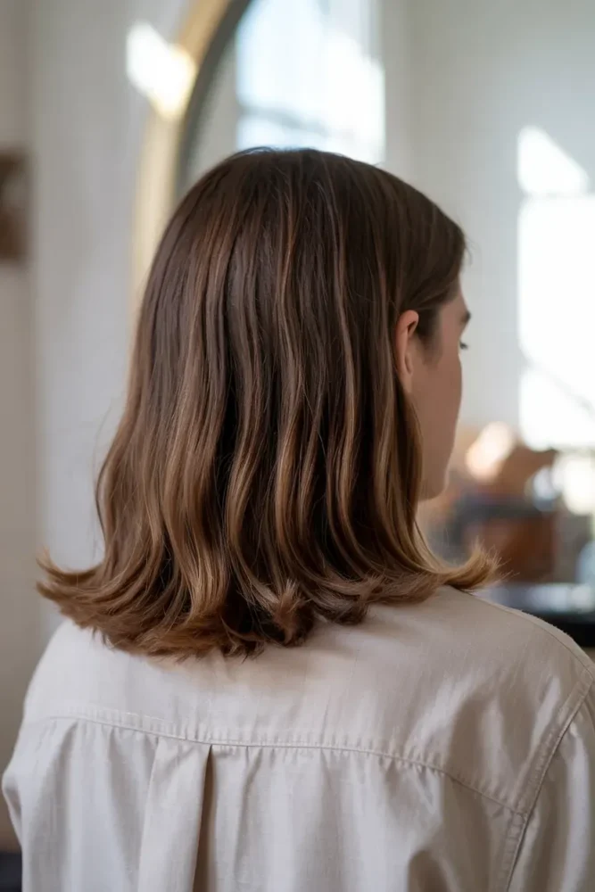 This mod-length haircut sits between the shoulders and chest, offering movement without bulk. Light layering keeps medium to long hair from feeling heavy while staying easy to style. It’s ideal for moms who want polish with minimal effort.