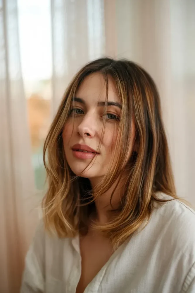 This is a go-to Mom Haircut for subtle change. Face-framing layers add softness around the cheeks and jawline, making it ideal for round or full face shapes. It works beautifully with medium to long hair textures.