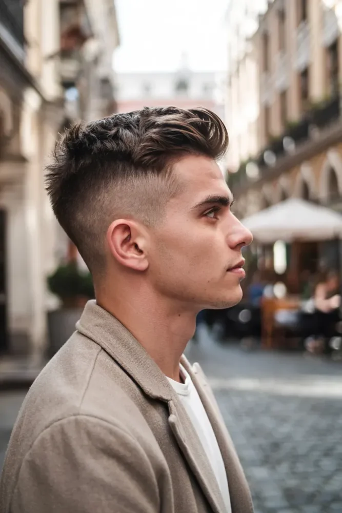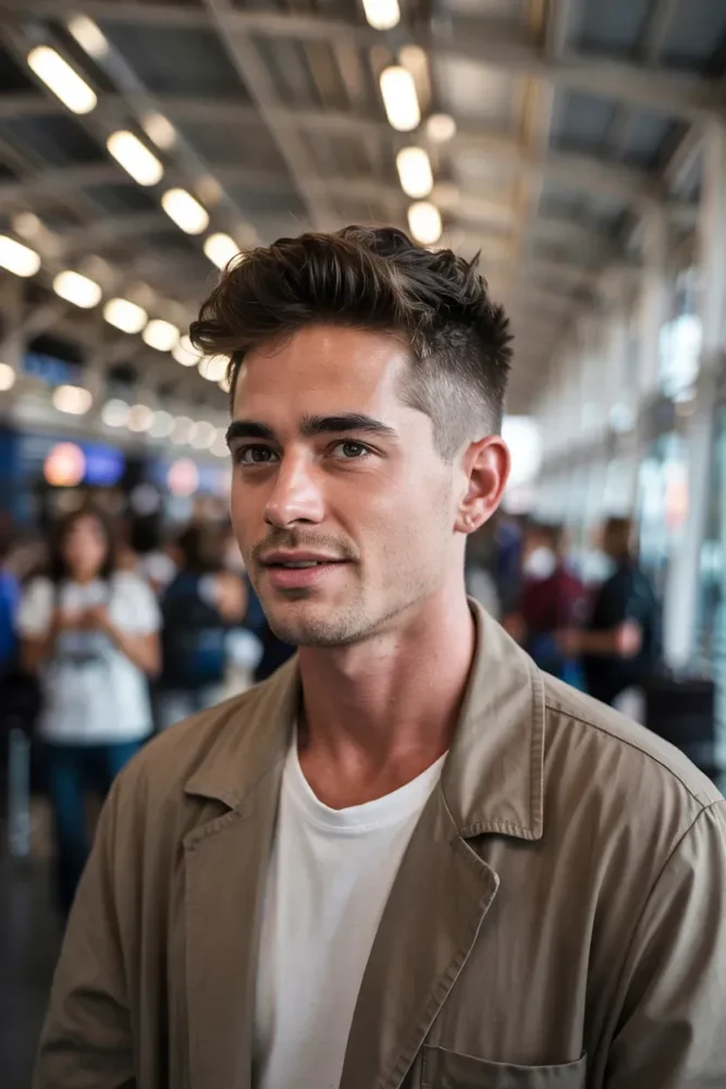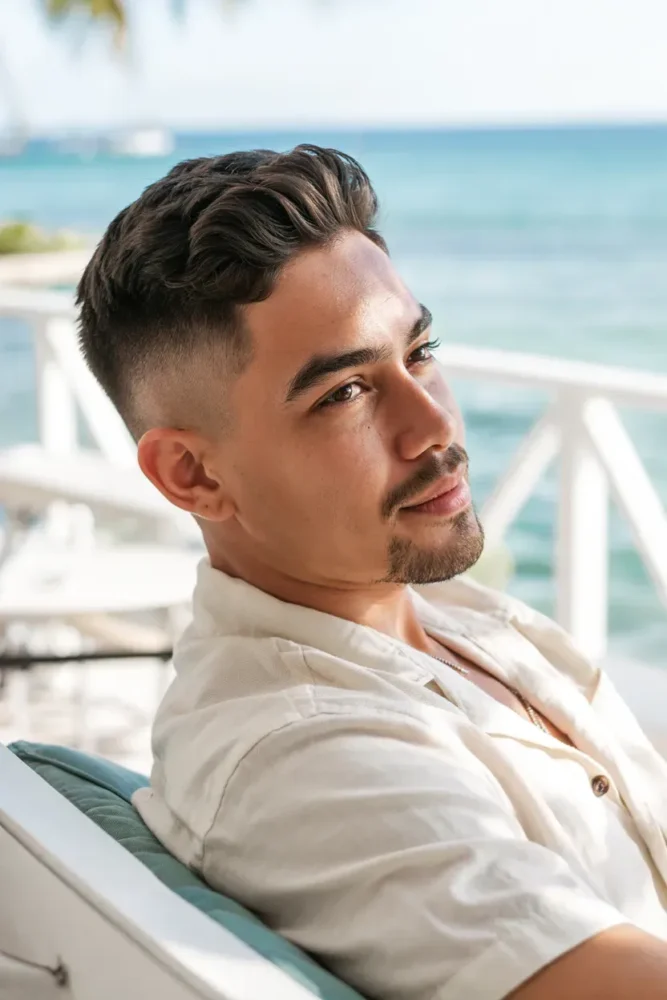This haircut balances clean edges with a relaxed top. The taper keeps it sharp, while the messy finish gives vacation vibes. It’s a classic man’s haircut that transitions easily from sightseeing to dinners.