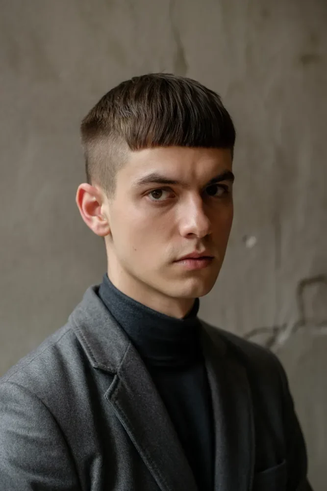 The fringe hides thinning at the front while the cropped sides keep everything balanced. This is a go-to European-inspired solution for thin straight hair.