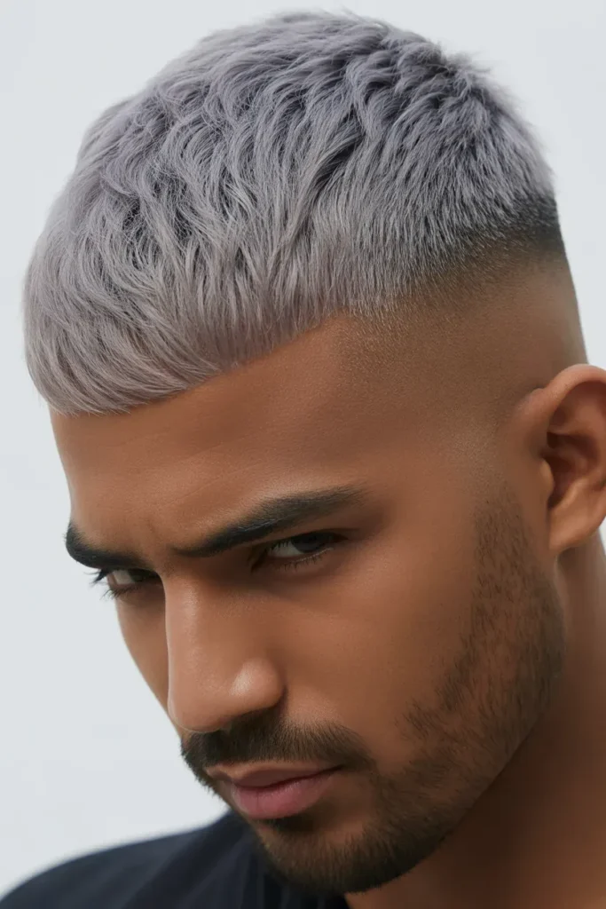 Ash highlights give a cool-toned, fashion-forward finish to a textured fade.
