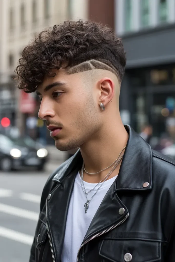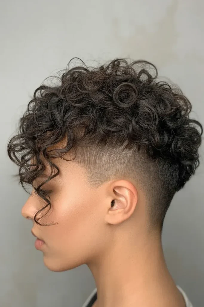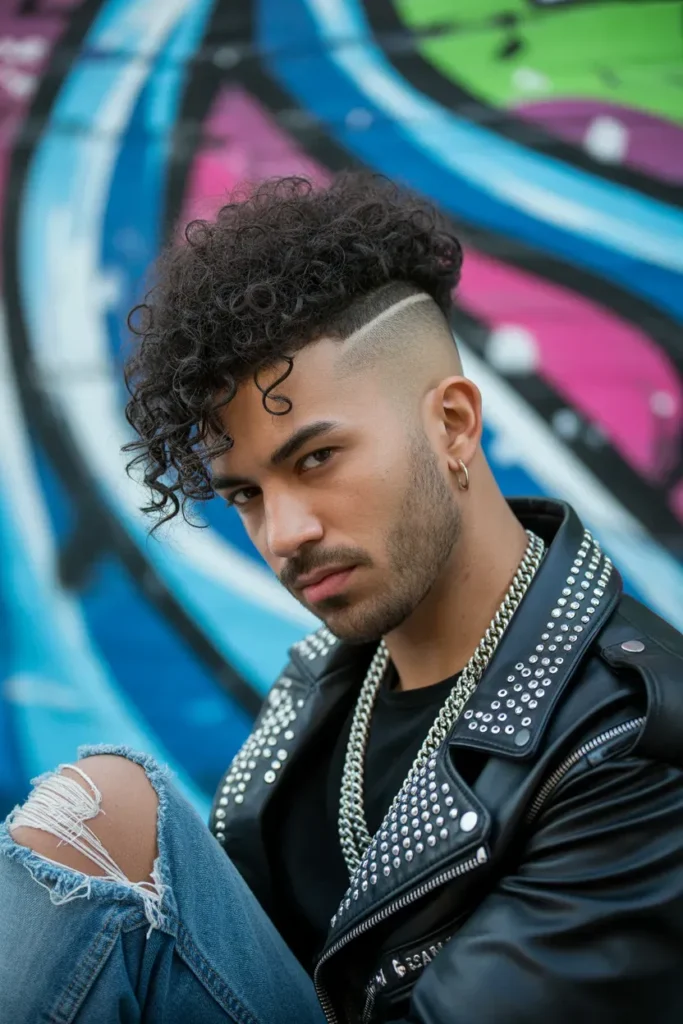 The curly mohawk is bold, fearless, and eye-catching. The sides are shaved or faded, while a strip of curls runs from front to back.