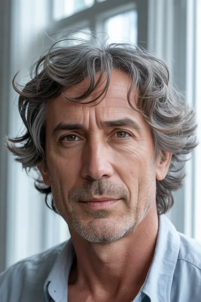 Medium-length grey hair with natural waves feels relaxed and artistic.