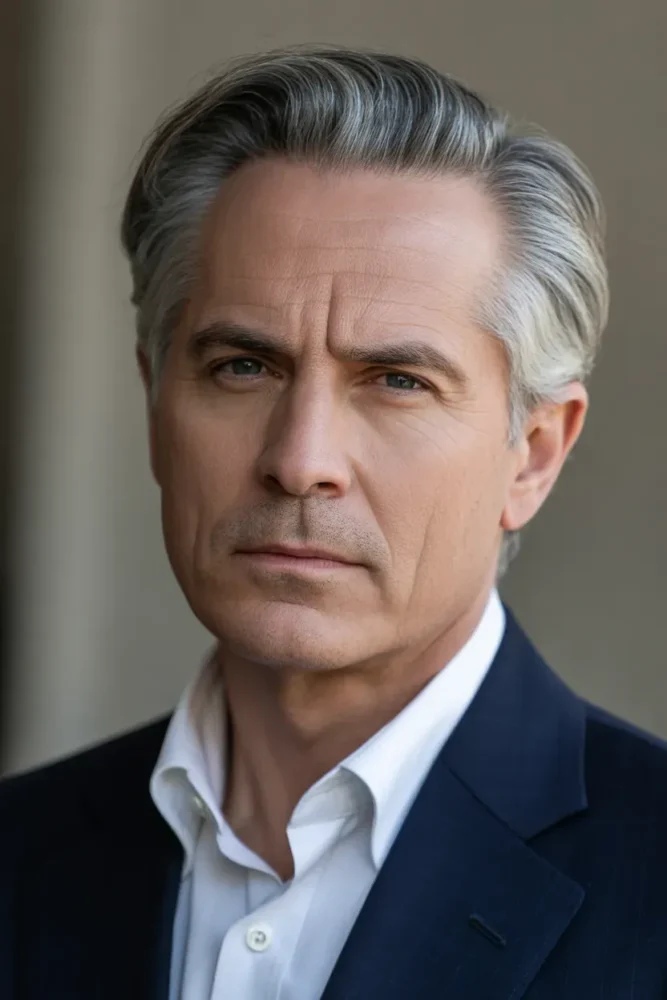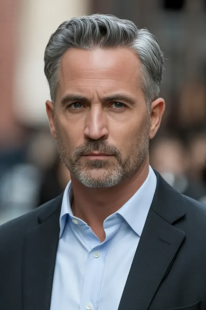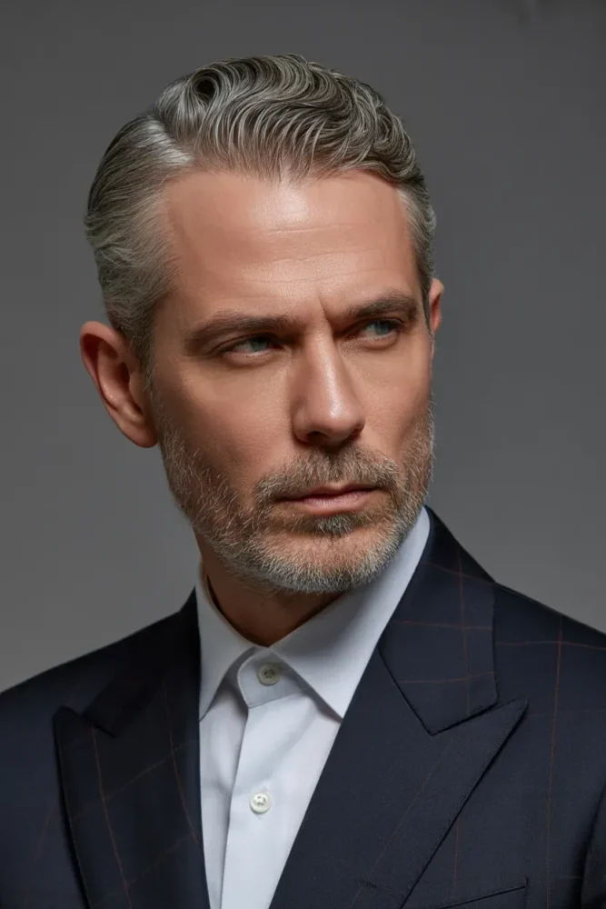 Slicked-back grey hair delivers confidence and authority.