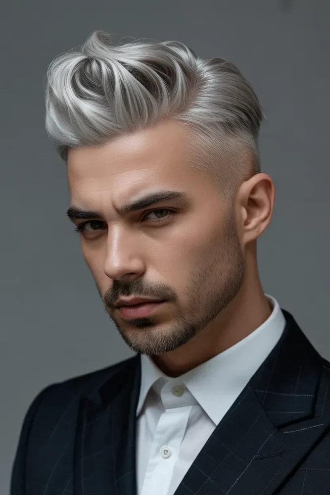 A grey pompadour blends vintage charm with modern confidence.