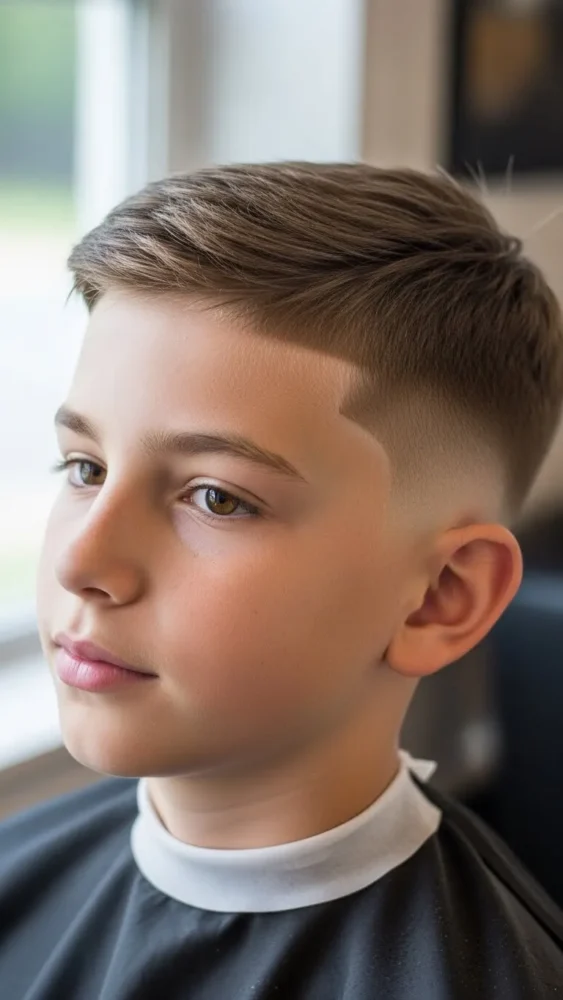 A low fade starts just above the ears, keeping the look subtle and age-appropriate.