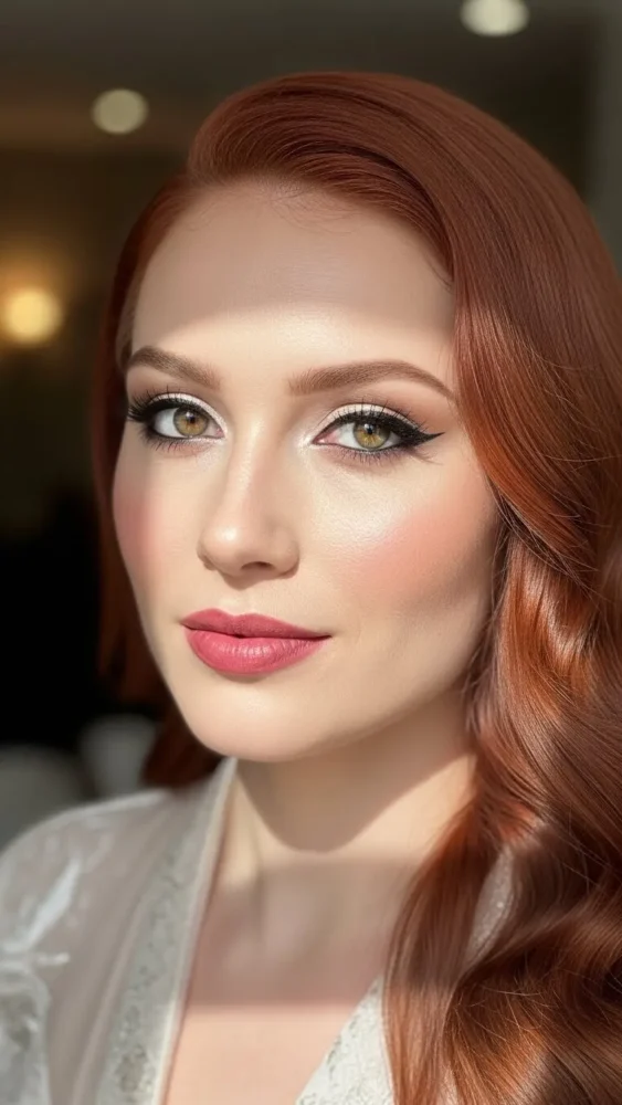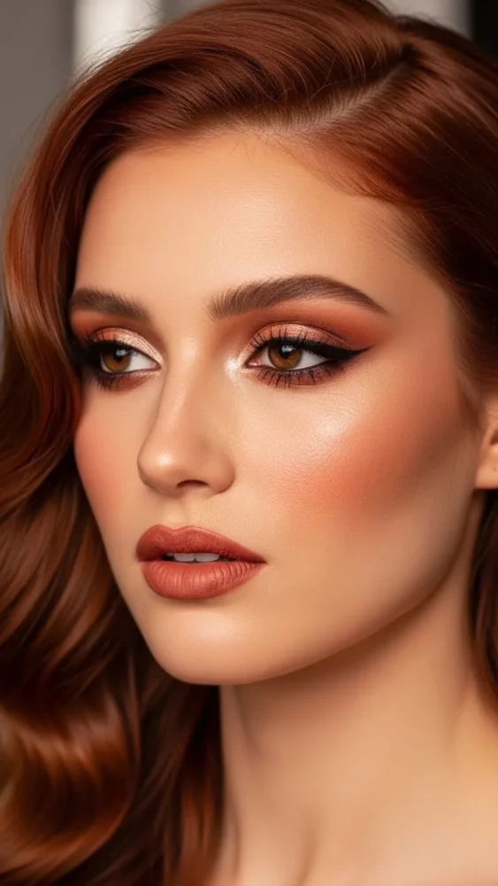 The right makeup elevates cherry red hair even more. Warm blush, soft eyeliner, and nude lips balance the bold color beautifully.