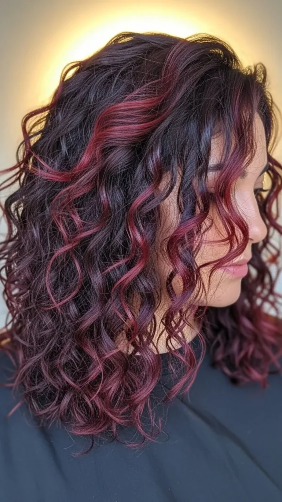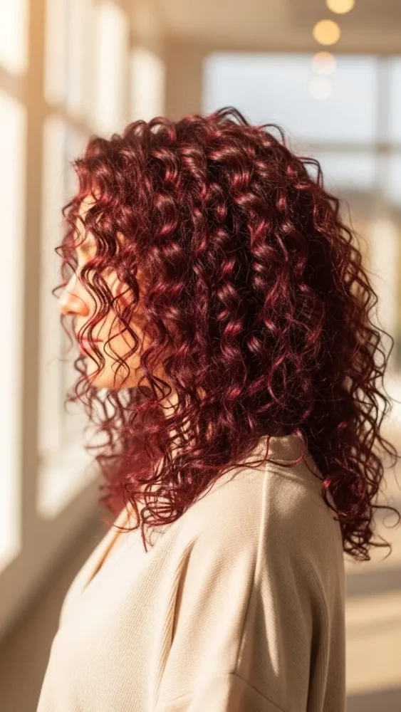 Curls make cherry red hair look dynamic and full of life. The color catches light differently on each curl, creating beautiful depth.