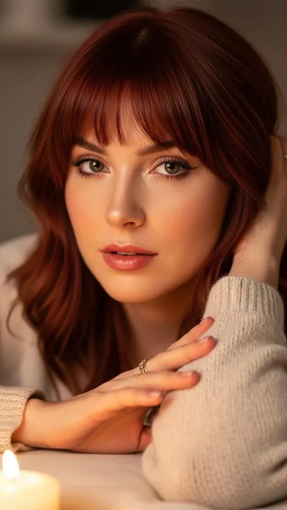 Bangs frame the face beautifully and make cherry red hair feel youthful and trendy. Curtain bangs are especially flattering.