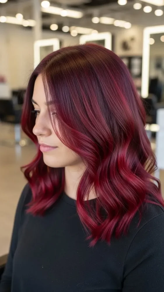 Ombre transitions from dark roots to cherry red ends for a dramatic yet blended effect.