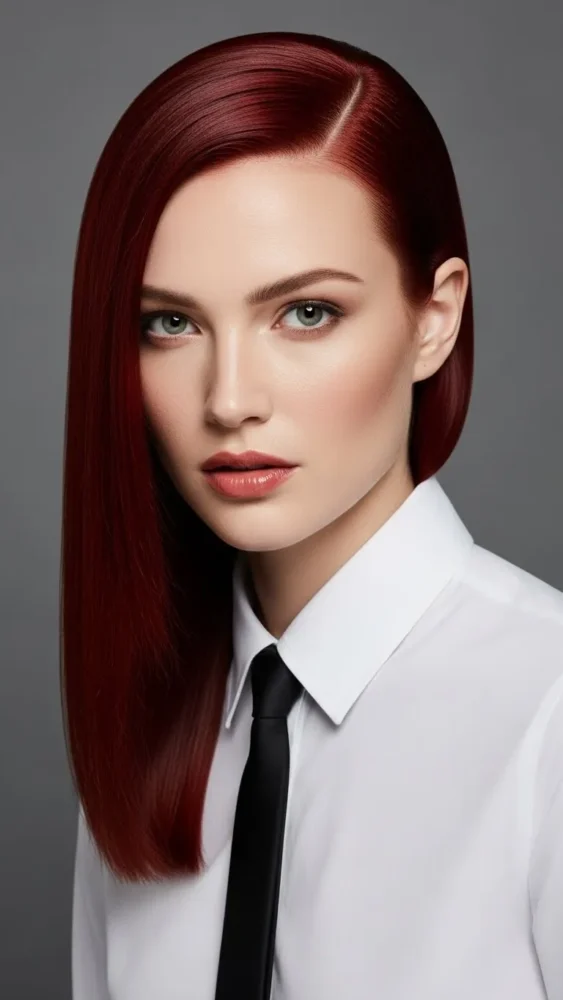 Straight styles show off the shine and smoothness of cherry red hair. The sleek finish makes the color look rich and luxurious.