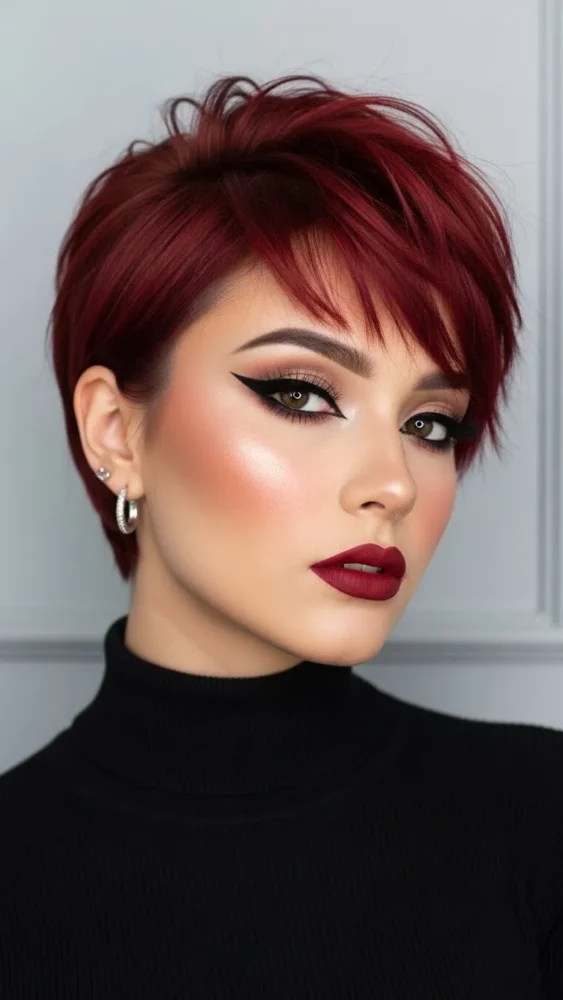 Short hair becomes instantly striking with cherry red color.