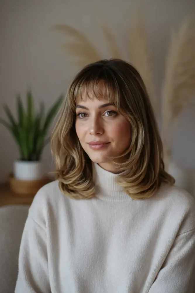 Curtain bangs paired with layers create a flattering, face‑softening effect.