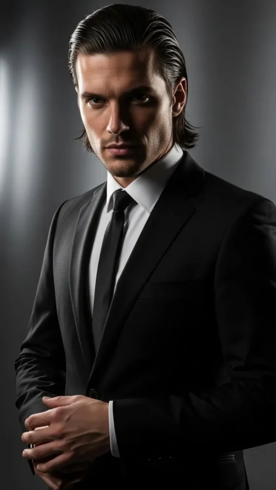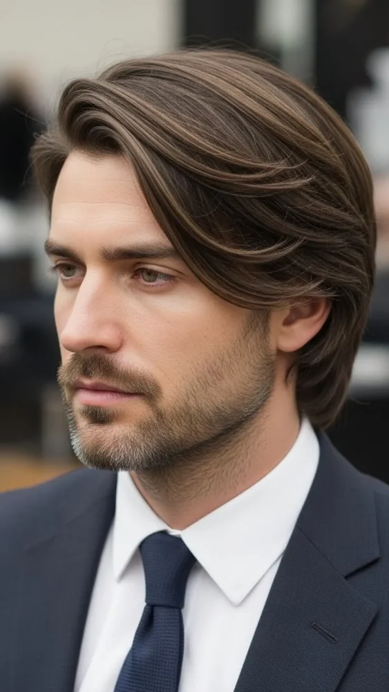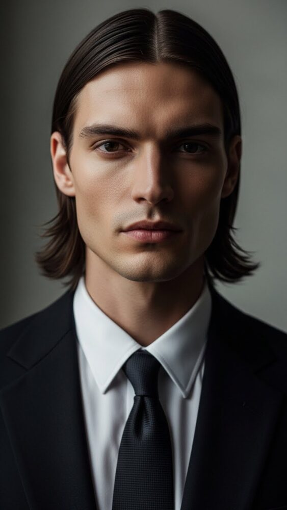 This is a powerful, confident men’s long haircut that works great for formal or business-casual looks.