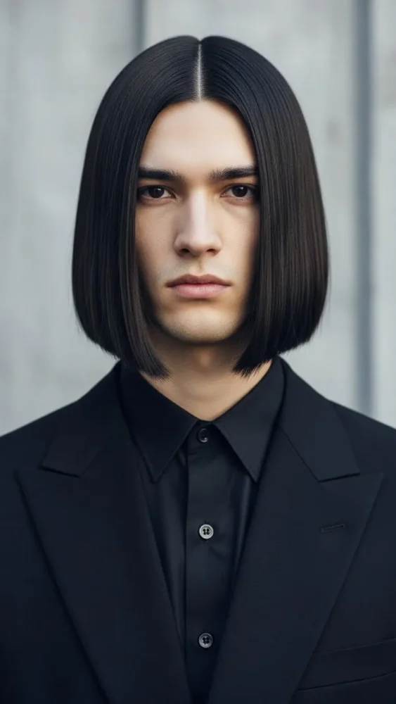 It’s symmetrical, clean, and especially flattering for men with thick hair.