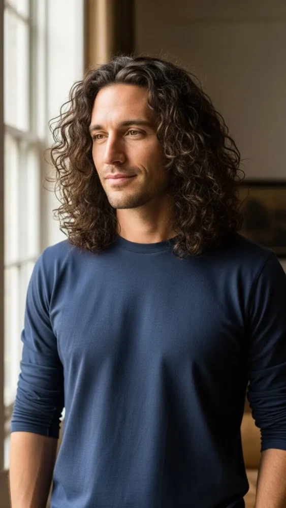 This men’s long haircut celebrates natural curls instead of hiding them.