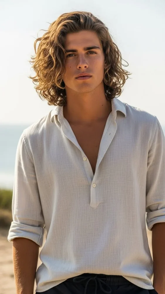 This relaxed men’s long haircut embraces natural wave patterns instead of fighting them.