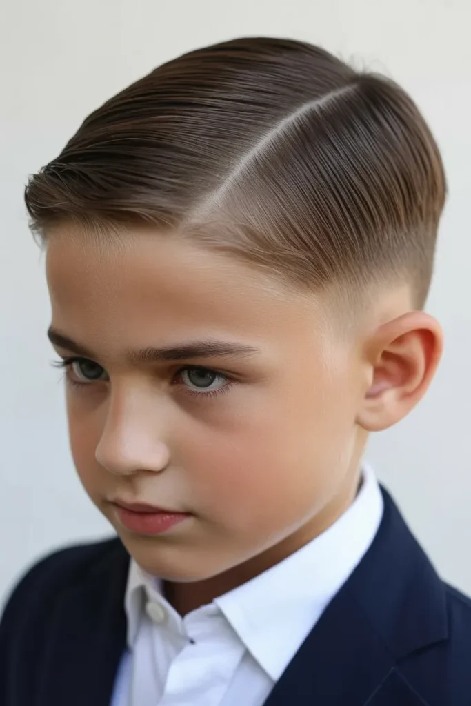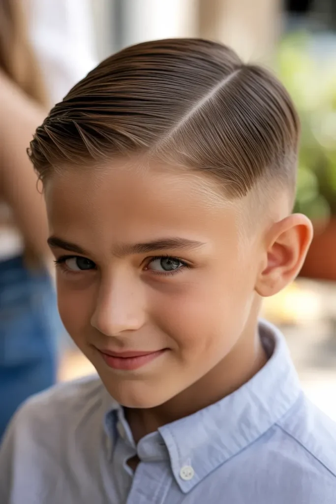 The side-parted short cut creates a classy and mature look. With a defined part and smooth flow, this hairstyle suits boys who like structure.