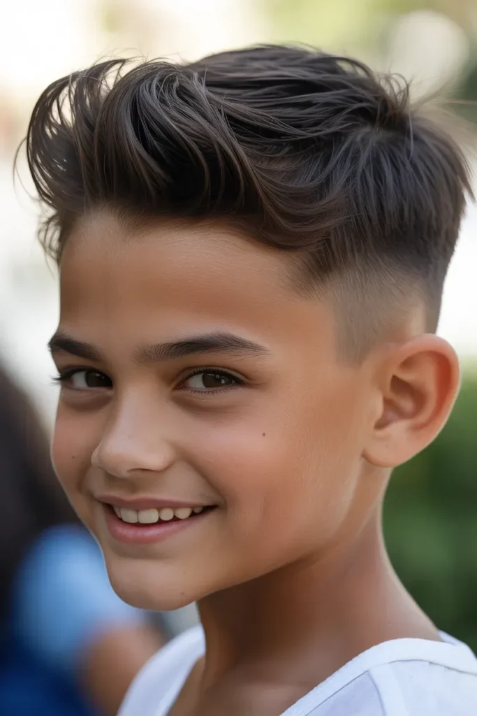 This trendy textured crop is ideal for boys who love a slightly messy but stylish vibe. The layered top adds depth and volume while the short sides keep it polished.