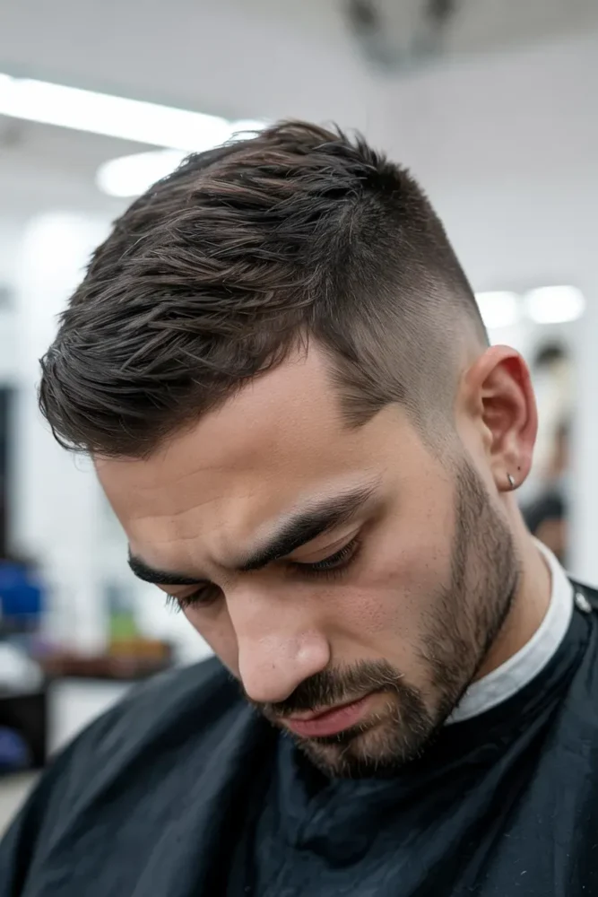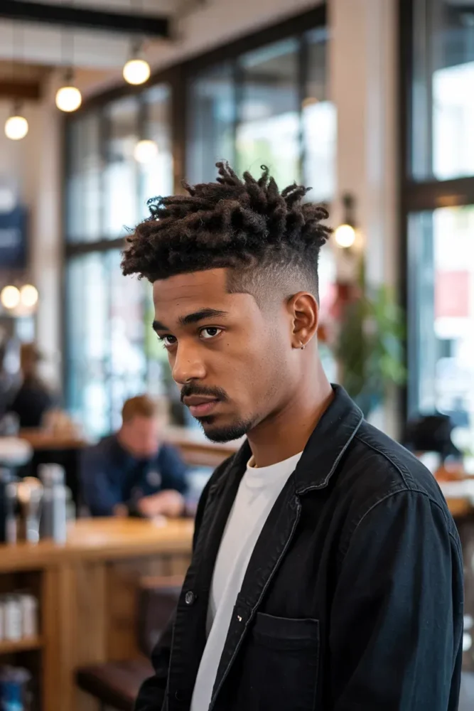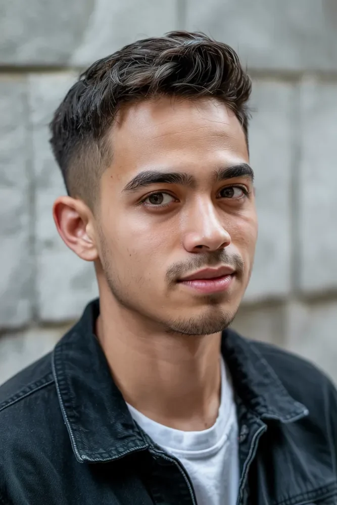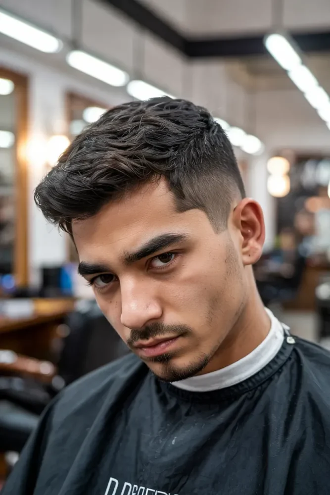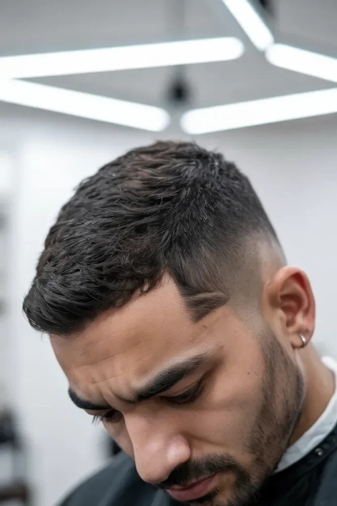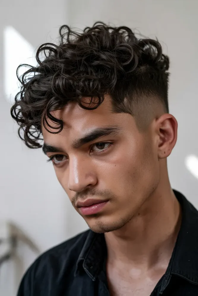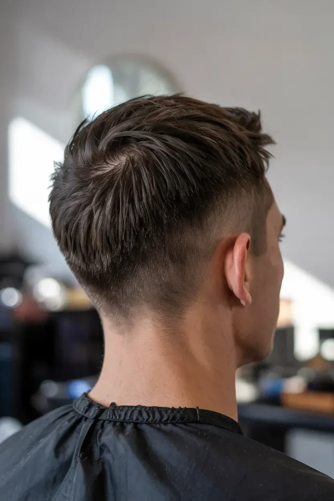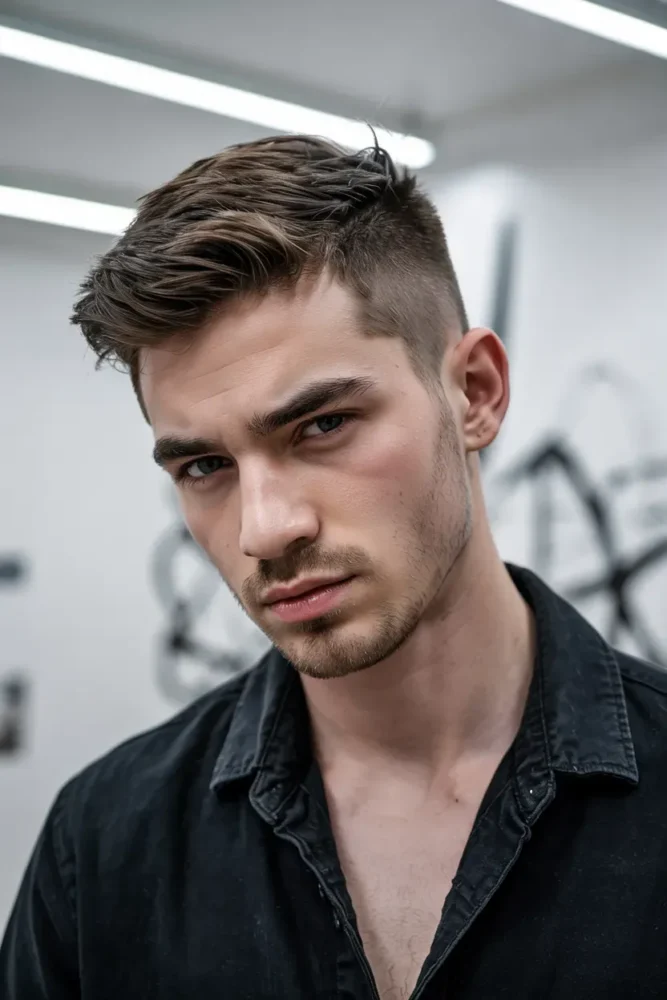 The contrast between a messy top and clean taper adds personality and edge.
