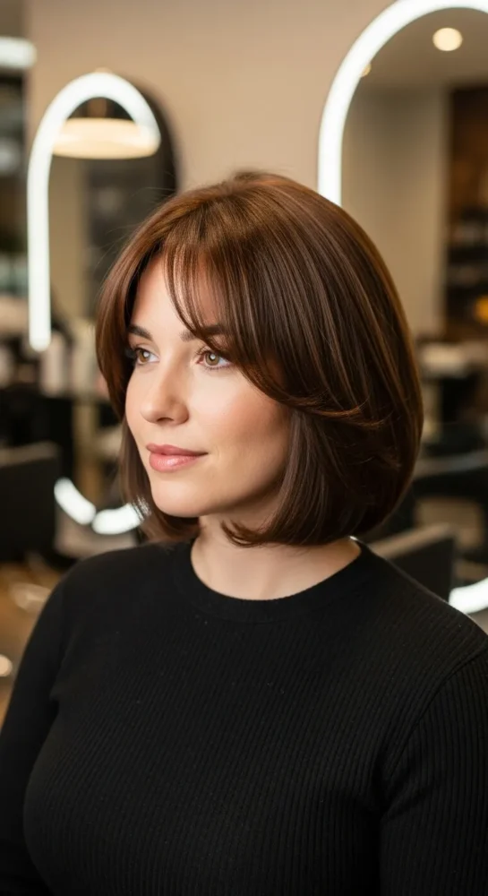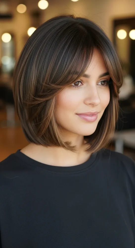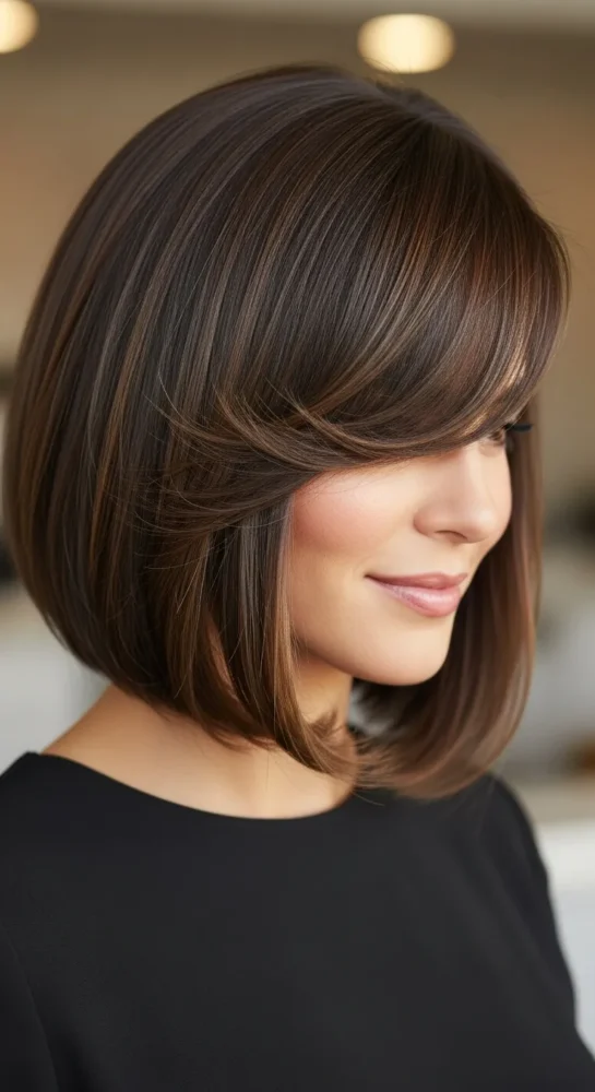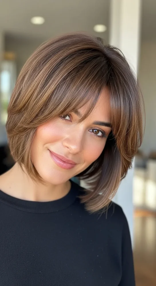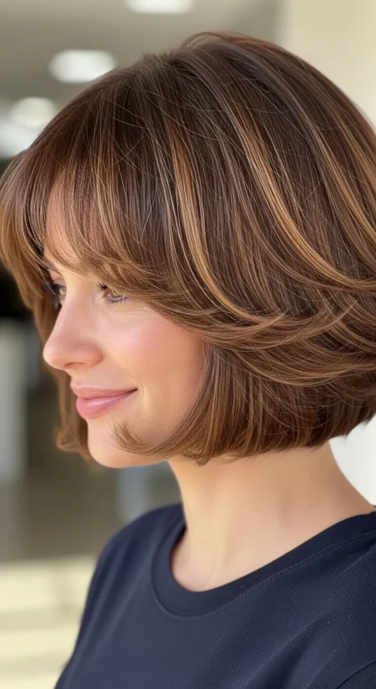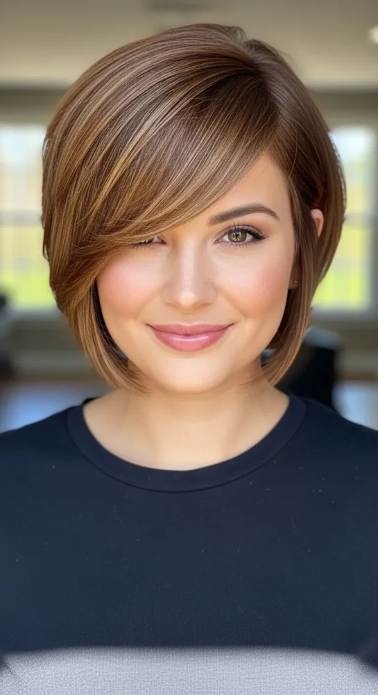 Texture brings life to this bob, while side-swept bangs add softness around the cheeks. It’s flattering, wearable, and ideal for women who don’t want harsh lines.