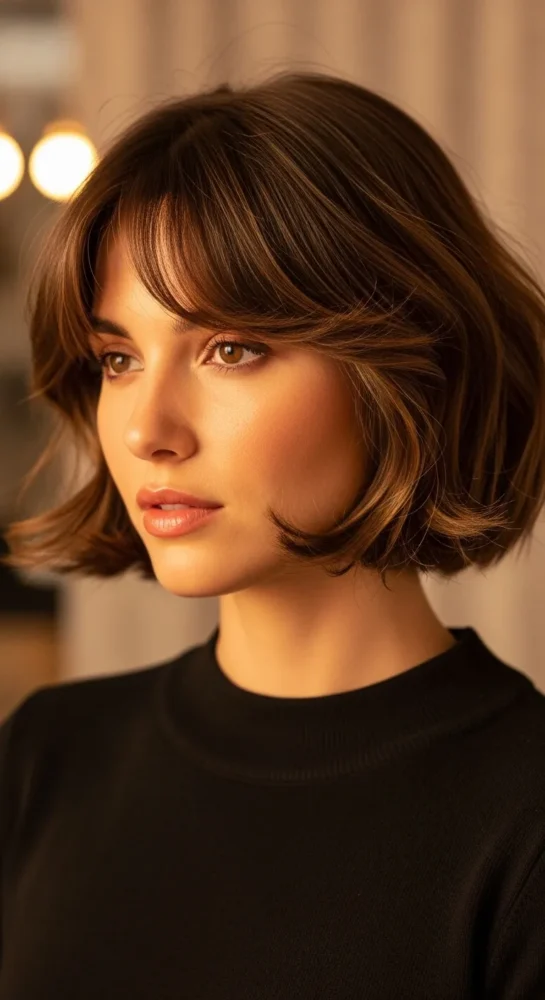 Curtain bangs instantly modernize a short bob. They open the face, grow out beautifully, and are easy to style with minimal effort—perfect for busy mornings.