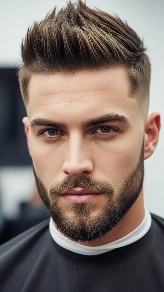 Pairing spiky hair with a faded beard creates a balanced, masculine look. The blend between hair and beard adds polish.