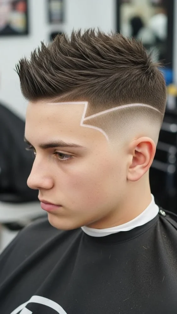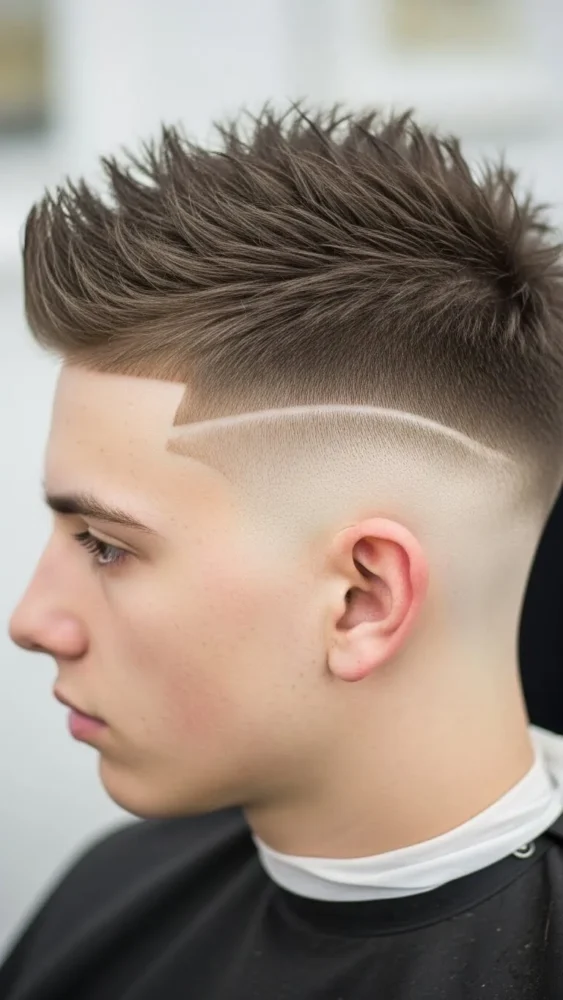 The temple fade adds a stylish twist without overwhelming the haircut. It highlights the spikes while keeping the sides neat.