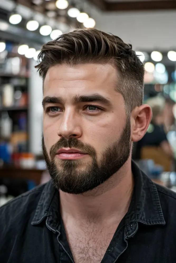 A slim short boxed beard offers clean structure without bulk. When sides are kept tight, this classic style becomes very flattering for round faces.