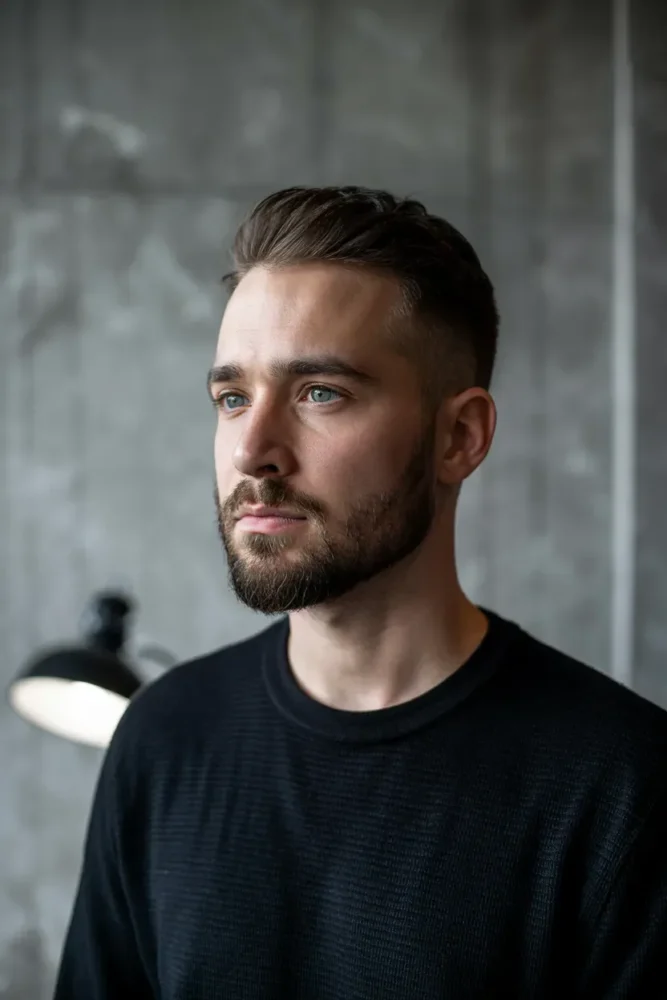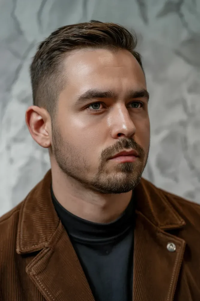 A shaped stubble beard is one of the easiest ways to slim a round face. Sharp cheek lines and a clean neckline instantly add structure without heavy growth. It’s ideal if you want a low-maintenance look that still improves face shape.