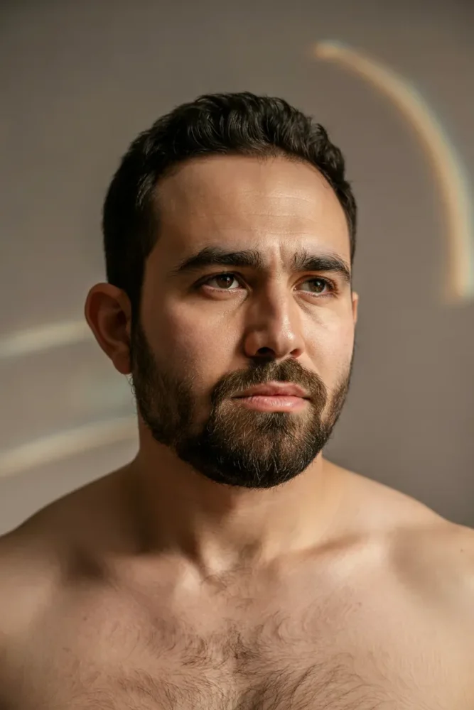 Light stubble paired with a sharp neckline lifts the jaw visually and adds instant structure.