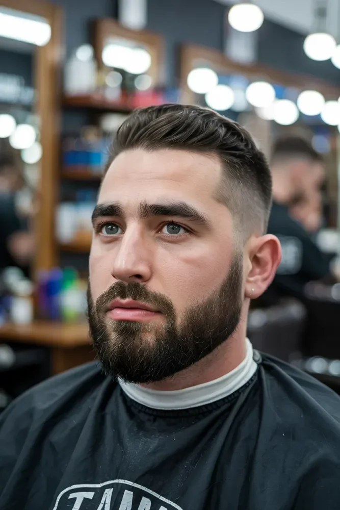 A beard fade gradually reduces hair toward the cheeks and ears, keeping attention on the jawline and chin.
