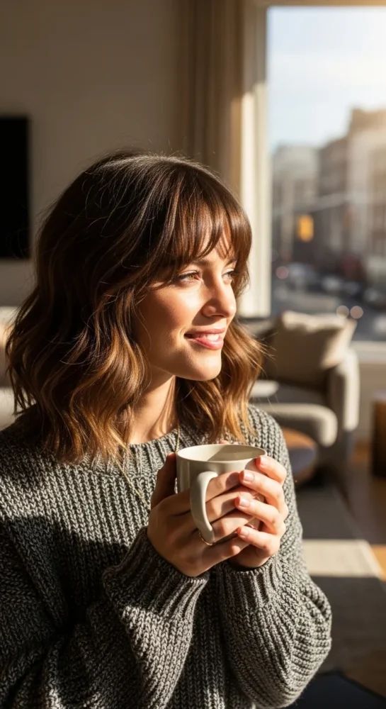 Soft waves paired with bangs create instant fullness. This is one of the best medium length hairstyles with bangs for thin hair when you want visible volume.